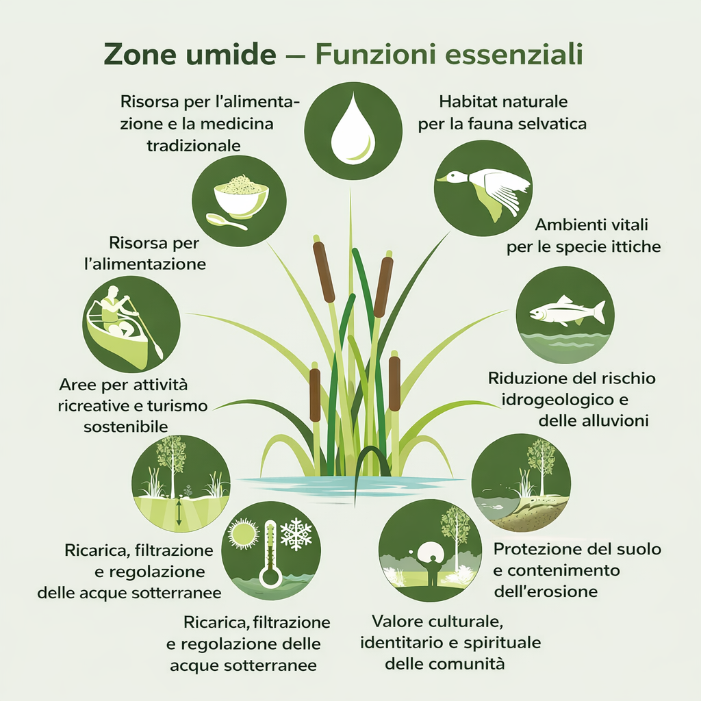 Dal punto di vista idrico, le zone umide rappresentano un presidio naturale di sicurezza collettiva. Esse assorbono l'acqua in eccesso durante eventi meteorologici estremi, riducendo il rischio di alluvioni, e la rilasciano progressivamente nei periodi di siccità, contribuendo alla ricarica delle falde. In un contesto segnato dall'intensificarsi degli eventi climatici estremi, la loro eliminazione equivale a smantellare una difesa naturale essenziale, sostituendola con opere artificiali spesso costose e meno efficaci.